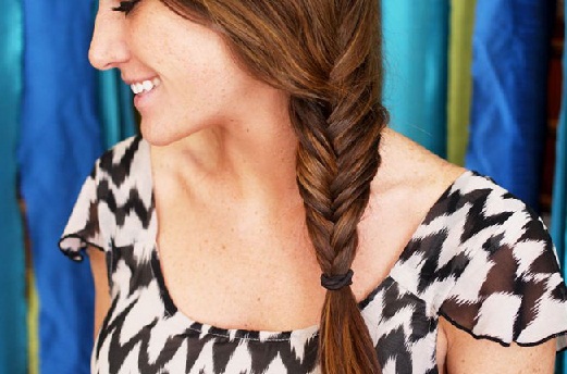 «Рыбный хвостик» заплетается из самых мелких по сравнению с остальными плетениями прядей. В этом плетении масса волос разделяется на затылке на две части, из которых, подбирая снизу мелкие прядки, заплетается коса. Верхняя часть плетения не должна стягиваться туго, и только к нижней части косы она переходит в тугое плетение, в котором вытягиваемые из-под низа косы прядки перебрасываются наверх в противоположную часть.
