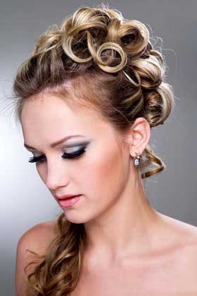 Еще один вариант причесок, в которых использованы накрученные пряди, это модель прически, в которой теменная часть головы накручивается на очень крупные бигуди, а остальные волосы – на средние. При формировании волосы на темени подвергаются несильному начесу, и закрываются крупными волнами гладких прядей, а пряди затылочной части, стянутые в хвост, укладываются в красивые, причудливые крупные завитки, которые жестко фиксируются лаком и укрепляются на затылке.
